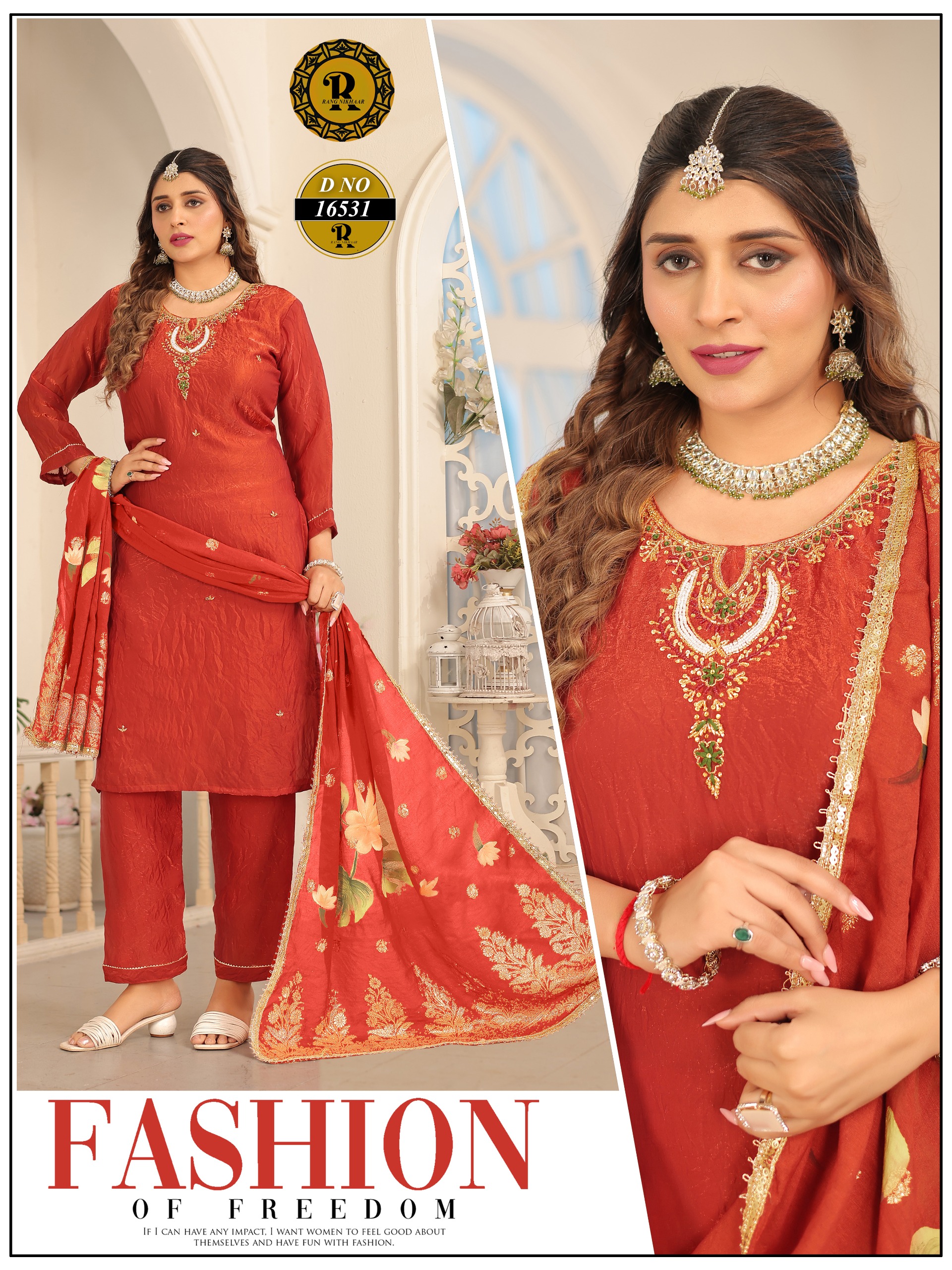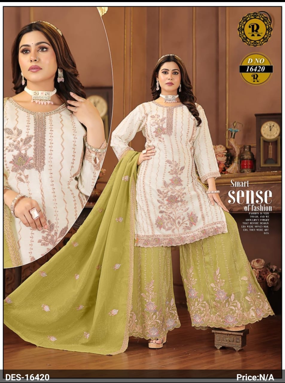 Our collection includes a wide range of Poshak dresses, embroidered suit sets, festive wear, party wear outfits, and designer three-piece sets crafted with rich fabrics, detailed embroidery, and elegant finishing.